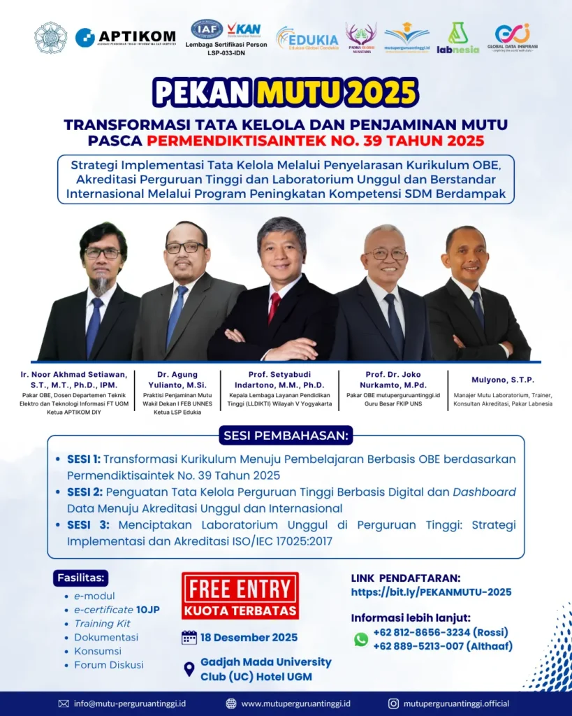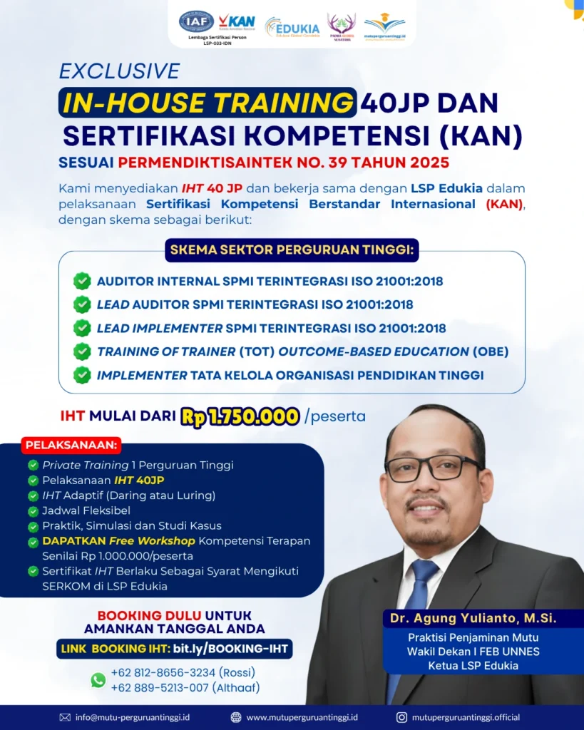 Sukses Terapkan Permendiktiristek 39/2025: Intip Hasil Bootcamp Merancang Kurikulum OBE Sukses Terapkan Permendiktiristek 39/2025: Intip Hasil Bootcamp Merancang Kurikulum OBE Bootcamp “Merancang Kurikulum Berbasis OBE (Outcome-Based Education)” telah sukses terselenggara! Program pelatihan yang transformatif ini menjadi sangat vital bagi perguruan tinggi di Indonesia, khususnya dalam menyambut tuntutan Permendiktiristek No. 39 Tahun 2025 terkait standar nasional pendidikan tinggi. Tujuan utama bootcamp ini jelas: memastikan kurikulum di perguruan tinggi benar-benar mampu menghasilkan lulusan yang berdaya saing global. Mari kita selami lebih dalam bagaimana pelatihan ini membantu institusi Anda mencapai standar mutu terbaik. Mengapa Kurikulum OBE Menjadi Mandatori? Transformasi pendidikan tinggi menuntut perubahan paradigma. Regulasi terbaru, terutama Permendiktiristek No. 39 Tahun 2025, menekankan pentingnya luaran (outcome) lulusan yang relevan dengan kebutuhan industri. Kurikulum OBE adalah kerangka kerja yang menjawab tantangan ini. Tujuan Utama Program ini dirancang untuk membantu pimpinan program studi dan dosen dalam: Mengatasi kendala implementasi Outcome-Based Education. Menyusun kerangka Kurikulum OBE yang sistematis dan terukur. Menyiapkan dokumen kurikulum untuk proses Pelatihan & Sertifikasi Kompetensi TOT OBE. Diselenggarakan secara daring dalam dua seri intensif pada Selasa, 18 November 2025, bootcamp ini menarik lebih dari 70 peserta dari berbagai perguruan tinggi. Dibimbing Langsung oleh Pakar OBE Nasional Keberhasilan program ini tidak lepas dari kehadiran dua narasumber ahli OBE terkemuka dari mutuperguruantinggi.id. Mereka memandu peserta mendapatkan pemahaman mendalam, terstruktur, dan aplikatif dalam merancang kurikulum berbasis outcome. Prof. Dr. Joko Nurkamto, M.Pd.: Guru Besar FKIP Universitas Sebelas Maret dan pakar OBE nasional. Prof. Dr. Saiful Ridlo, M.Si.: Pakar OBE dari Universitas Negeri Semarang. Kehadiran dua pakar ini menjamin materi yang Anda terima langsung terintegrasi dengan konteks pendidikan tinggi Indonesia dan standar global. Dua Seri Strategis dalam Merancang Kurikulum OBE yang Berdampak Kurikulum OBE yang BerdampakPelatihan ini dibagi menjadi dua sesi fokus yang saling melengkapi. Seri 1: Transformasi Pembelajaran Menuju OBE (09.00–12.00 WIB) Pada sesi ini, peserta fokus pada pemahaman fundamental OBE. Kami mengupas tuntas: Pengertian, Regulasi, dan Filosofi OBE; Karakteristik Utama OBE; Perbedaan Input-Based vs Outcome-Based Education; Jenis Capaian Pembelajaran (Learning Outcome – LO); hingga implementasi praktisnya di Pendidikan Tinggi. Oleh karena itu, sesi ini membantu peserta memahami urgensi transformasi pembelajaran dan perubahan paradigma yang harus diadopsi institusi. Seri 2: Merancang Kurikulum OBE yang Berdampak (13.00–16.00 WIB) Setelah memahami fondasi, Seri 2 berfokus pada aspek teknis perancangan. Materi esensial yang dibahas meliputi: Analisis Kebutuhan dan Profil Lulusan; Penyusunan Capaian Pembelajaran Lulusan (CPL); Pemetaan Mata Kuliah terhadap CPL; serta prosedur Evaluasi dan Revisi Kurikulum. Dengan demikian, materi ini memberikan kerangka kerja yang jelas bagi perguruan tinggi untuk merancang kurikulum yang relevan, adaptif, dan kredibel. Apresiasi Peserta: Kurikulum OBE Jadi Lebih Actionable Di sesi penutup, evaluasi dari peserta memberikan apresiasi positif yang luar biasa. Rata-rata penilaian program mencapai Bintang 5, menandakan keberhasilan program dalam mencapai tujuan pelatihan. Materi tersampaikan secara sistematis dan mudah dipahami. Konsep kompleks tentang Kurikulum OBE diuraikan menjadi langkah-langkah yang actionable (dapat langsung diterapkan). Bootcamp ini berhasil menjembatani gap antara regulasi, standar nasional, dan implementasi praktis di kelas. Peserta secara khusus memuji kemampuan Prof. Dr. Joko Nurkamto dan Prof. Dr. Saiful Ridlo dalam menyederhanakan konsep OBE menjadi panduan yang aplikatif bagi pimpinan prodi. Jangan Berhenti pada Kurikulum, Perkuat Mutu Institusi Anda! Bootcamp 18 November 2025 berkontribusi besar mendukung kesiapan perguruan tinggi menghadapi standar pendidikan tinggi Permendiktiristek No. 39 Tahun 2025. Penguasaan kurikulum OBE memang kunci awal, tetapi integrasi mutu ke dalam seluruh sistem institusi adalah penentu utama akreditasi Anda. Jangan berhenti pada kurikulum! Perkuat sistem penjaminan mutu institusi Anda secara menyeluruh! Ambil Langkah Nyata Sekarang! Konsultasikan Implementasi OBE di Kampus Anda Apakah Anda siap membawa perguruan tinggi Anda ke level akreditasi yang lebih tinggi dengan sistem penjaminan mutu yang terintegrasi? Perkuat kapasitas institusi Anda melalui In House Training, Pendampingan, Pelatihan Publik, atau Sertifikasi Kompetensi Person bersama pakar mutu Mutuperguruantinggi.id. Hubungi Narahubung Kami SEGERA melalui WhatsApp untuk Diskusi Solusi Terbaik! Kontak WhatsApp: KLIK DISINI Jangan lupa follow Instagram kami di @mutuperguruantinggi.official untuk informasi update mengenai Upcoming Events selanjutnya!