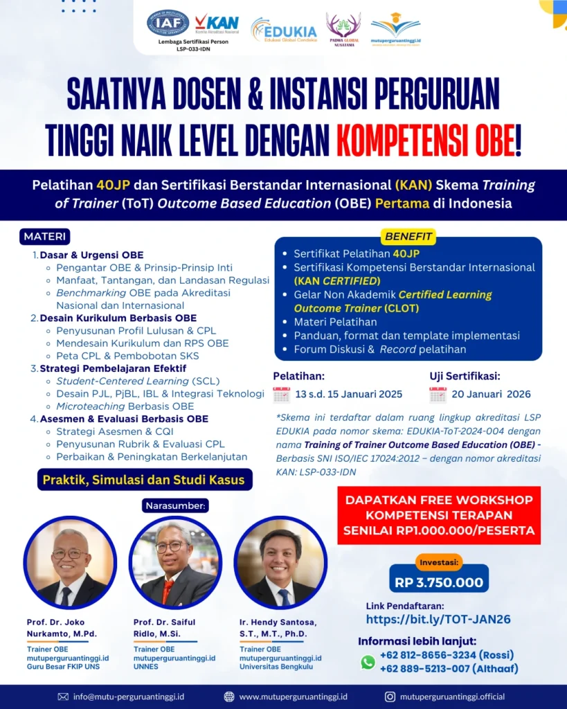 IKUTI JUGA Sertifikasi Kompetensi berlisensi KAN untuk memenuhi IKU 4 Perguruan Tinggi Anda! Bootcamp OBE Seri 1: 18 November 2025Seri 2: 25 November 2025 Training of Trainer (ToT) Outcome Based Education (OBE) Pelatihan: 09-11 Desember 2025Ujian Sertifikasi: 16 Desember 2025 Pembayaran dapat di transfer via Bank Mandiri KCP Ungaran 13605 No Rekening. 136-00-3302872-8 a.n PT EDUKASI GLOBAL CENDEKIA Informasi lebih lanjut, hubungi admin Rossi (wa.me/6281286563234) Memuat…