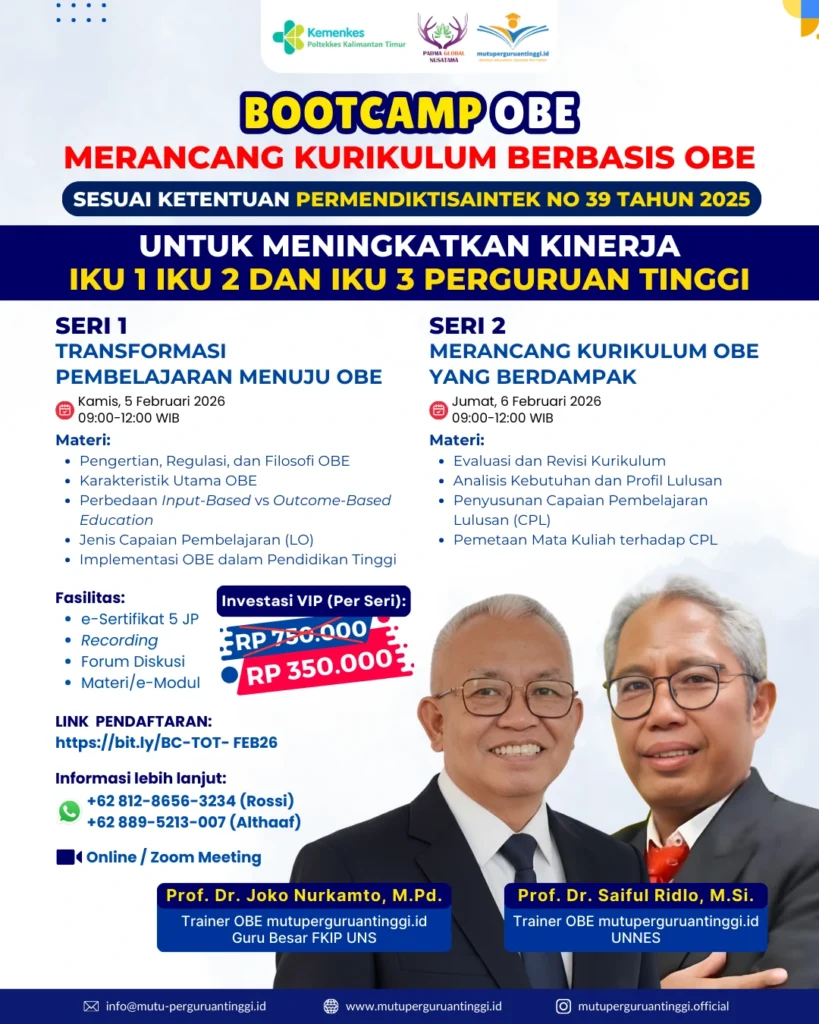 Strategi Jitu Merancang Kurikulum OBE: Solusi Mutuperguruantinggi.id Bersama Poltekkes Kemenkes Kaltim Strategi Jitu Merancang Kurikulum OBE: Solusi Mutuperguruantinggi.id Bersama Poltekkes Kemenkes Kaltim Pendidikan tinggi di Indonesia saat ini tengah menghadapi tantangan besar dalam menyelaraskan profil lulusan dengan kebutuhan industri yang dinamis. Menjawab tantangan tersebut, Mutuperguruantinggi.id bekerja sama dengan Poltekkes Kemenkes Kalimantan Timur dan Padma Global Nusantara sukses menyelenggarakan Bootcamp OBE bertajuk “Merancang Kurikulum Berbasis OBE” pada awal Februari 2026. Kegiatan ini dirancang khusus untuk membantu institusi pendidikan tinggi dalam membedah regulasi terbaru. Selain itu, peserta diajak mengimplementasikannya secara teknis guna mendongkrak performa universitas di kancah nasional. Mengapa Kurikulum OBE Menjadi Urgensi di Tahun 2026? Urgensi dari pelatihan ini berakar pada kewajiban perguruan tinggi untuk menyesuaikan standar pendidikan dengan Permendiktisaintek No. 39 Tahun 2025. Kurikulum berbasis Outcome-Based Education (OBE) bukan sekadar perubahan dokumen administratif. Sebaliknya, OBE merupakan pergeseran fokus fundamental dari “apa yang diajarkan” menjadi “apa yang mampu dilakukan oleh lulusan”. Dengan penerapan OBE yang tepat, perguruan tinggi dapat secara signifikan meningkatkan capaian Indikator Kinerja Utama (IKU), antara lain: IKU 1: Kesiapan Lulusan mendapatkan pekerjaan layak. IKU 2: Mahasiswa mendapatkan pengalaman di luar kampus. IKU 3: Dosen berkegiatan di luar kampus. Penerapan standar ini menjadi barometer penting dalam menentukan kualitas dan daya saing sebuah institusi, baik di tingkat nasional maupun internasional. Menghadirkan Pakar Penjaminan Mutu Terbaik Keberhasilan bootcamp ini tidak lepas dari peran narasumber yang memiliki rekam jejak panjang dalam penjaminan mutu pendidikan. Para peserta mendapatkan bimbingan langsung dari: Prof. Dr. Joko Nurkamto, M.Pd. (Trainer OBE Mutuperguruantinggi.id & Guru Besar FKIP UNS). Prof. Dr. Saiful Ridlo, M.Si. (Trainer OBE Mutuperguruantinggi.id dari UNNES). Kedua pakar ini memberikan perspektif yang berimbang antara landasan teoretis yang kuat dan aplikasi praktis di lapangan. Oleh karena itu, para peserta mampu meraih pemahaman yang holistik dan aplikatif. Struktur Program: Dari Transformasi Hingga Teknis Perancangan Program ini berlangsung dalam dua seri intensif yang mencakup seluruh aspek pengembangan kurikulum masa depan: Seri 1: Transformasi Pembelajaran Menuju OBE Pada sesi pertama (5 Februari 2026), diskusi berfokus pada pemahaman dasar, regulasi, dan filosofi pendidikan. Peserta membedah perbedaan mendasar antara model Input-Based dengan Outcome-Based Education. Selain itu, peserta mempelajari jenis-jenis Learning Outcomes (LO) serta strategi implementasinya dalam struktur pendidikan tinggi. Seri 2: Merancang Kurikulum OBE yang Berdampak Sesi kedua (6 Februari 2026) hadir dengan pendekatan yang lebih teknis. Materi mencakup evaluasi dan revisi kurikulum, analisis kebutuhan profil lulusan, hingga penyusunan Capaian Pembelajaran Lulusan (CPL). Tidak hanya itu, peserta juga melakukan pemetaan mata kuliah yang selaras dengan CPL untuk memastikan kurikulum yang terintegrasi. Testimoni Peserta: Rating Bintang 5 untuk Kualitas Materi Meskipun dilaksanakan secara daring melalui platform Zoom Meeting, antusiasme puluhan peserta dari berbagai wilayah di Indonesia tetap tinggi. Dengan investasi sebesar Rp350.000, para peserta mendapatkan nilai tambah yang luar biasa, mulai dari e-sertifikat bernilai 5 JP, akses rekaman kegiatan, hingga modul materi eksklusif. Dalam sesi evaluasi, tiga perwakilan peserta memberikan testimoni positif. Mereka mengungkapkan bahwa metode pelatihan sangat sistematis dan membantu mereka memahami celah dalam kurikulum lama. Para peserta juga memberikan Rating Bintang 5 atas kesabaran narasumber dalam membedah kasus spesifik serta manajemen acara yang sangat tertib. Amankan Masa Depan Institusi Anda Bersama Kami Penyusunan kurikulum yang adaptif adalah investasi jangka panjang bagi masa depan mahasiswa dan institusi Anda. Jika Anda melewatkan bootcamp kali ini, pastikan Anda menjadi yang pertama terdaftar dalam sesi selanjutnya untuk memastikan kampus Anda siap memenuhi standar Permendiktisaintek No. 39 Tahun 2025. Kami siap membantu Anda melalui layanan: In-House Training (Pelatihan di Kampus Anda) Pendampingan Kurikulum & Penjaminan Mutu Pelatihan Publik & Sertifikasi Kompetensi Person Hubungi Kami Sekarang! Jangan tunda transformasi kampus Anda. Klik tombol di bawah ini untuk berkonsultasi langsung dengan tim admin kami melalui WhatsApp: Hubungi Admin via WhatsApp: Chat Admin Rossi – 081286563234 Chat Admin Althaaf – 08895213007 Kunjungi juga media sosial kami untuk informasi terbaru: Website: www.mutuperguruantinggi.id Instagram: @mutuperguruantinggi.official