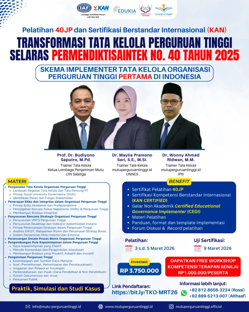 Strategi Implementasi Permendiktisaintek No. 39 Tahun 2025: Sukses Pelatihan Lead Implementer SPMI & ISO 21001 Strategi Implementasi Permendiktisaintek No. 39 Tahun 2025: Sukses Pelatihan Lead Implementer SPMI & ISO 21001 Dunia pendidikan tinggi Indonesia saat ini sedang berada di ambang transformasi besar. Hal ini terjadi seiring dengan berlakunya Permendiktisaintek No. 39 Tahun 2025. Sebagai langkah proaktif dalam merespons regulasi tersebut, Mutuperguruantinggi.id sukses menyelenggarakan kegiatan prestisius bertajuk “Pelatihan 40JP dan Sertifikasi Lead Implementer SPMI Terintegrasi ISO 21001”. Acara ini menjadi momentum krusial bagi para pengelola mutu. Tujuannya adalah memastikan institusi mereka tidak hanya patuh secara hukum, tetapi juga unggul secara operasional di level internasional. Menjawab Tantangan Tata Kelola Perguruan Tinggi Modern Pelatihan ini hadir secara khusus untuk menjawab tantangan tata kelola kampus yang kian kompleks. Fokus utamanya adalah membekali peserta dengan kemampuan menyusun strategi SPMI yang terintegrasi dengan standar global ISO 21001 (Sistem Manajemen Organisasi Pendidikan). Melalui pendekatan berbasis risiko, kampus dapat mendeteksi hambatan sejak dini. Selain itu, integrasi ini memastikan siklus PPEPP (Penetapan, Pelaksanaan, Evaluasi, Pengendalian, dan Peningkatan) berjalan secara berkelanjutan dan terukur. Kolaborasi Pakar: Membedah Mutu dari Berbagai Aspek Keberhasilan pelatihan ini tidak lepas dari peran para narasumber ahli yang membedah setiap aspek secara mendalam. Berikut adalah poin-poin penting yang dipelajari peserta: Pondasi Konseptual & Regulasi: Dr. Muhammad Rosiawan, M.T. mengupas tuntas keterkaitan kebijakan internal kampus dengan Permendiktisaintek terbaru. Integrasi Standar Internasional: Dr. Ir. Desiana Vidayanti, M.T. menjelaskan bagaimana ISO 21001 memperkuat akreditasi nasional tanpa menghilangkan identitas institusi. Manajemen Risiko Praktis: Andika, S.Psi. membimbing peserta dalam menyusun dokumentasi risiko yang valid dan sistematis. Evaluasi & Perbaikan Berkelanjutan: Dr. Wonny Ahmad Ridwan, S.E., M.M. memberikan simulasi nyata mengenai teknik audit mutu internal yang efektif. Seluruh materi tersebut disampaikan melalui simulasi interaktif dan studi kasus nyata. Dengan demikian, peserta pulang membawa kemahiran teknis yang siap diaplikasikan, bukan sekadar teori. Pengakuan Kompetensi Melalui Sertifikasi Resmi Rangkaian agenda intensif ini berlangsung pada 27 hingga 29 Januari 2026 untuk sesi pembekalan materi. Selanjutnya, untuk memastikan kompetensi peserta diakui secara legal dan profesional, uji sertifikasi dilaksanakan pada 3 Februari 2026. Meskipun berlangsung secara virtual, intensitas interaksi antara instruktur dan peserta tetap terjaga dengan sangat baik. Testimoni Peserta: Kepuasan Maksimal dengan Rating Bintang 5 Banyak peserta mengungkapkan bahwa kegiatan ini merupakan pengalaman belajar yang sangat mencerahkan. Mereka merasa kurikulum yang disusun oleh Mutuperguruantinggi.id sangat relevan dan memberikan solusi aplikatif bagi permasalahan di institusi masing-masing. “Penjelasan narasumber sangat jernih dan mampu menyederhanakan konsep manajemen risiko yang kompleks menjadi langkah yang mudah diimplementasikan,” ujar salah satu perwakilan peserta. Apresiasi tinggi juga diberikan kepada tim panitia atas manajemen waktu yang disiplin dan ketersediaan rekaman pelatihan yang membantu proses review mandiri. Sebagai bentuk validasi kualitas, para peserta sepakat memberikan Rating Bintang 5. Siap Membawa Kampus Anda Menuju Standar Global? Jangan biarkan perguruan tinggi Anda tertinggal dalam mengadopsi standar mutu terbaru. Raih gelar non-akademik Certified Quality Assurance Implementer (CQAI) dan tingkatkan daya saing institusi Anda bersama kami. Kami melayani In House Training, Pendampingan, hingga Sertifikasi Kompetensi Person yang disesuaikan dengan kebutuhan kampus Anda. Hubungi kami sekarang untuk konsultasi gratis: WhatsApp: Klik di Sini untuk Chat via WhatsApp (0812-8656-3234) Instagram: @mutuperguruantinggi.official