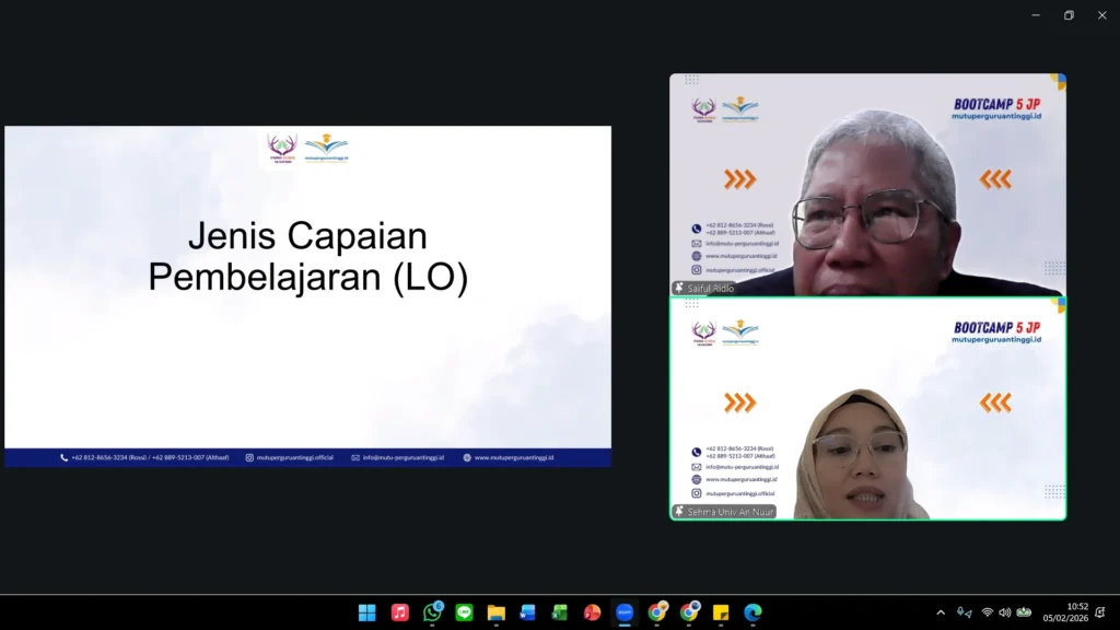 Pada sesi pertama (5 Februari 2026), diskusi berfokus pada pemahaman dasar, regulasi, dan filosofi pendidikan. Peserta membedah perbedaan mendasar antara model Input-Based dengan Outcome-Based Education. Selain itu, peserta mempelajari jenis-jenis Learning Outcomes (LO) serta strategi implementasinya dalam struktur pendidikan tinggi.